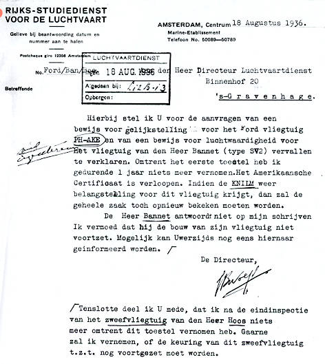 * Op 22 mei 1936 stuurt Vliegtuigenfabriek Bannet te Zeist “teekeningen en verdere vereischte bescheiden voor een sport- en