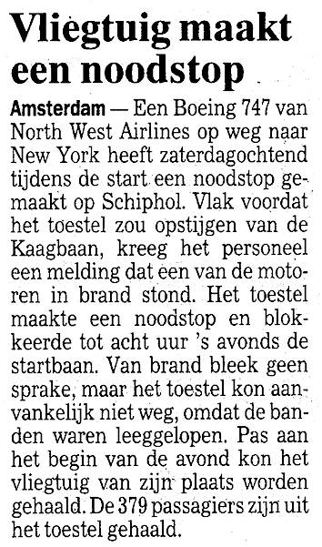 toestel, na dumpen van 2000 kg brandstof boven de Noordzee, terug naar Schiphol.