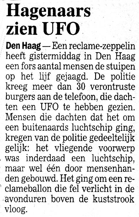 Fel verlicht vloog het reclame-luchtschip langs de kust. De Hagenaars zagen het voor een UFO aan, de
