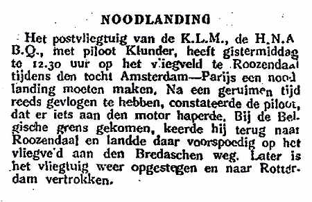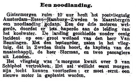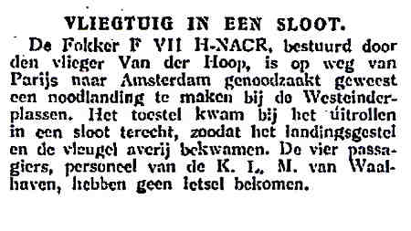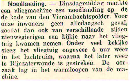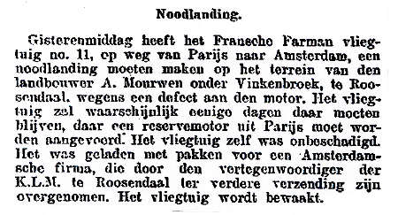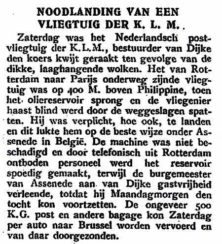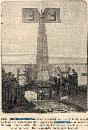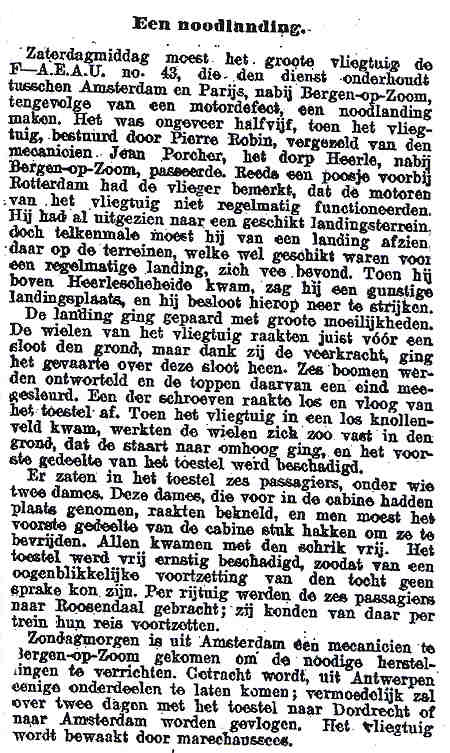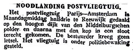 postvliegtuig van de lijn Parijs-Amsterdam heeft een noodlanding langs de dijk