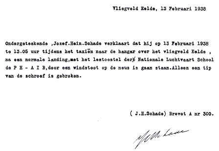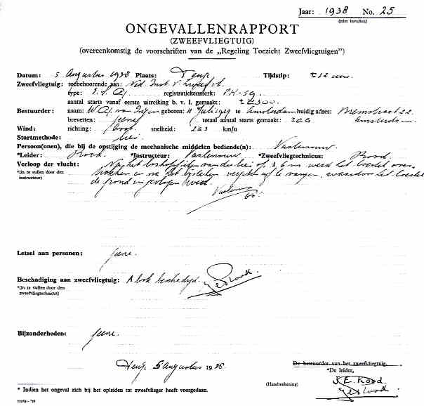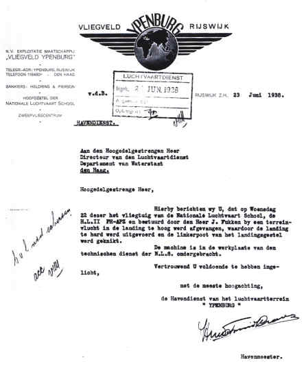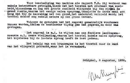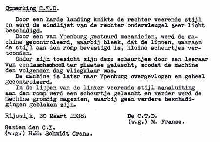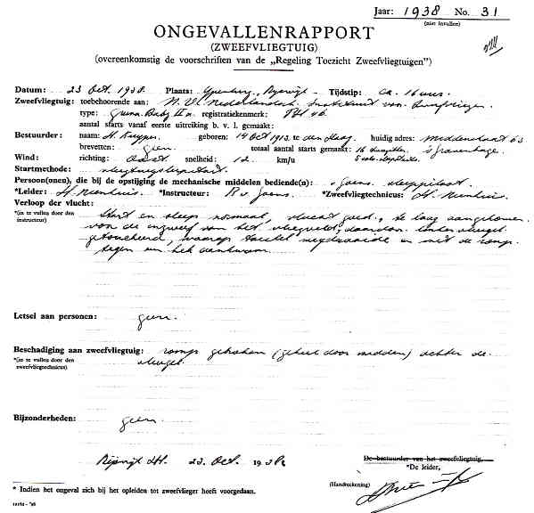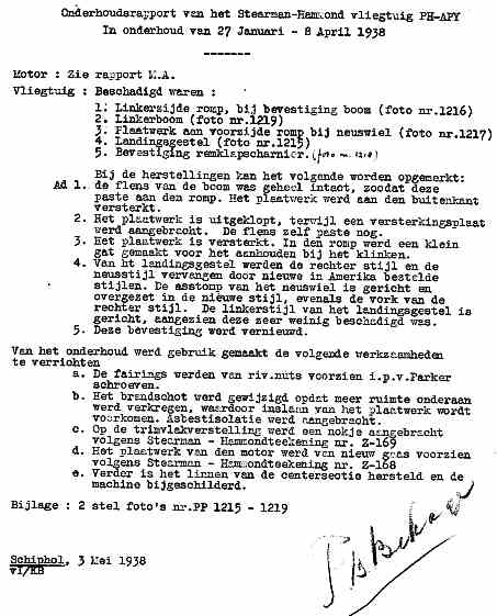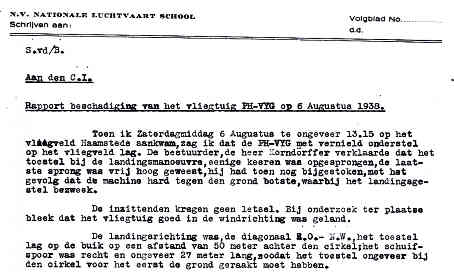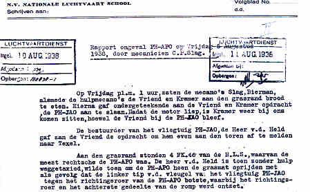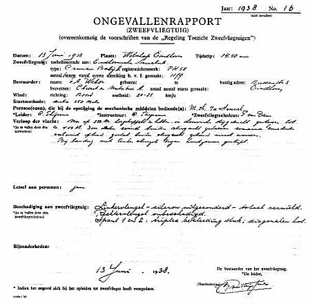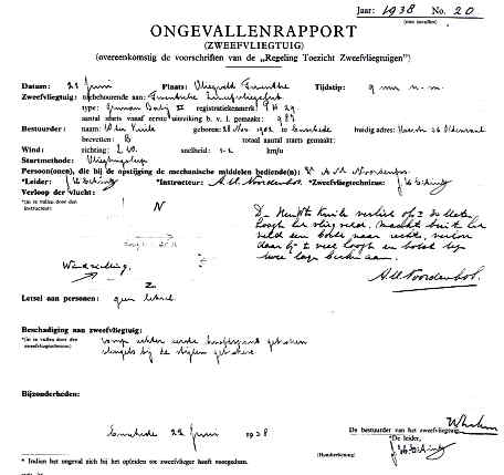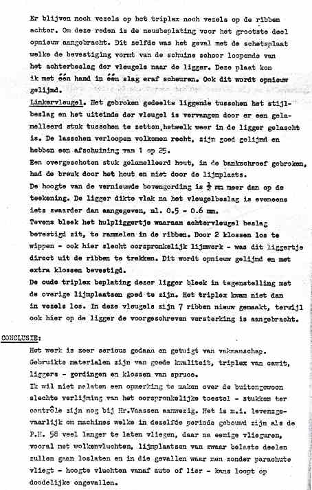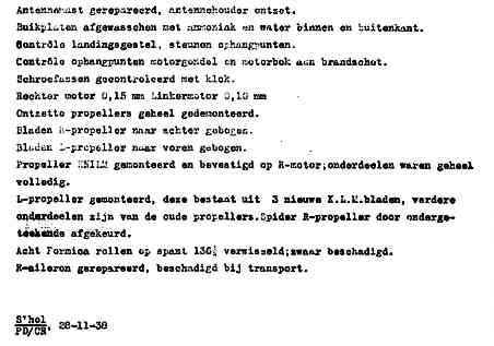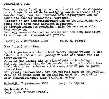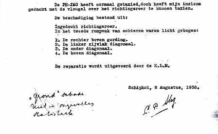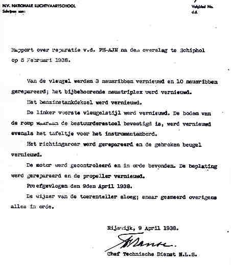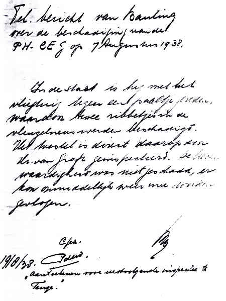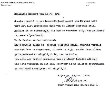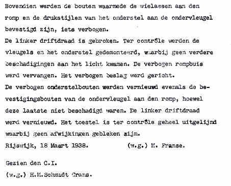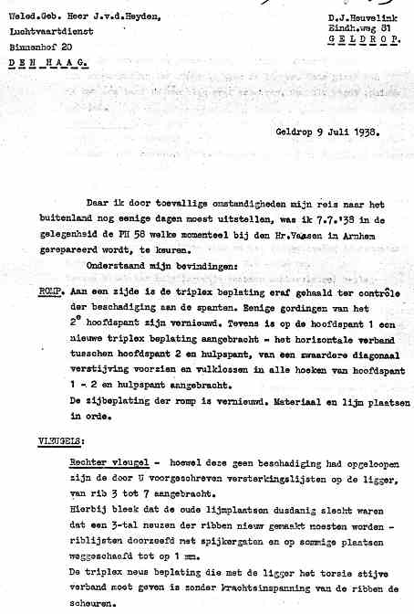 | Rechts het keuringsverslag dat D.J. Heuvelink opmaakte na inspectie van de reparatie van de PH-58. (Coll. H. Dekker) Ongevallenrapport 1938-16. (Coll. H. Dekker) ![]() |
