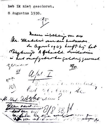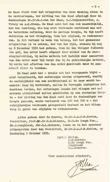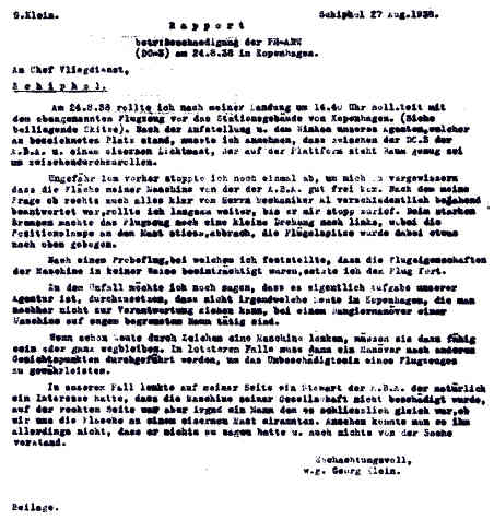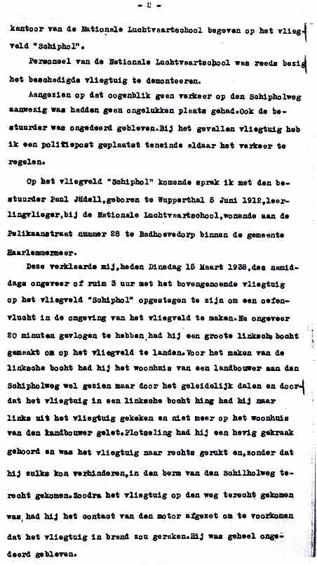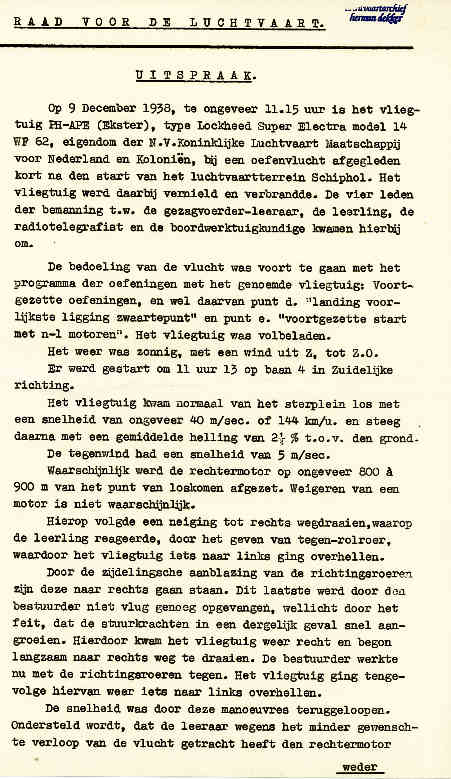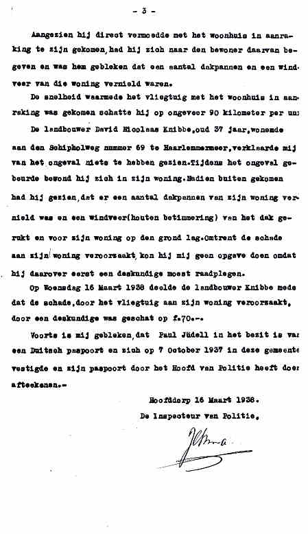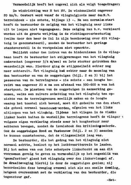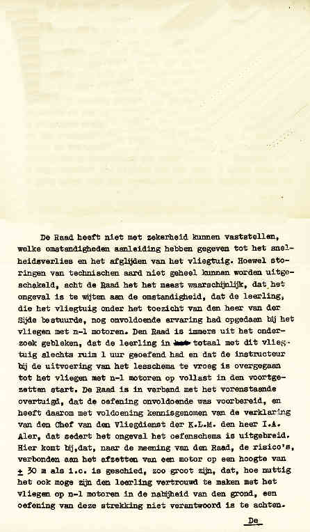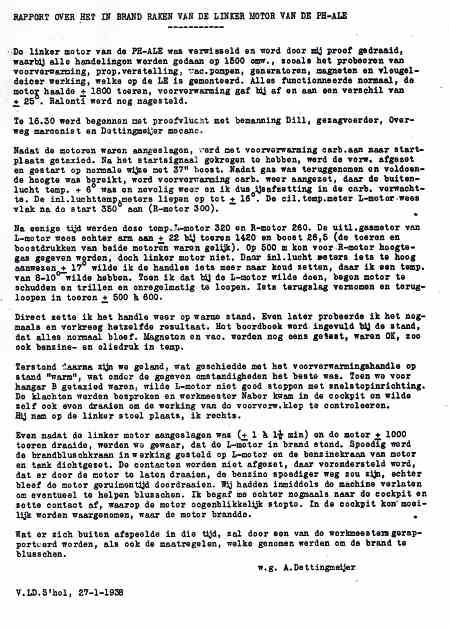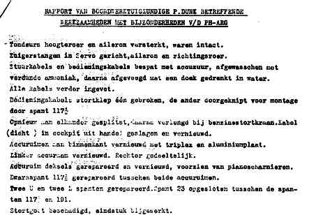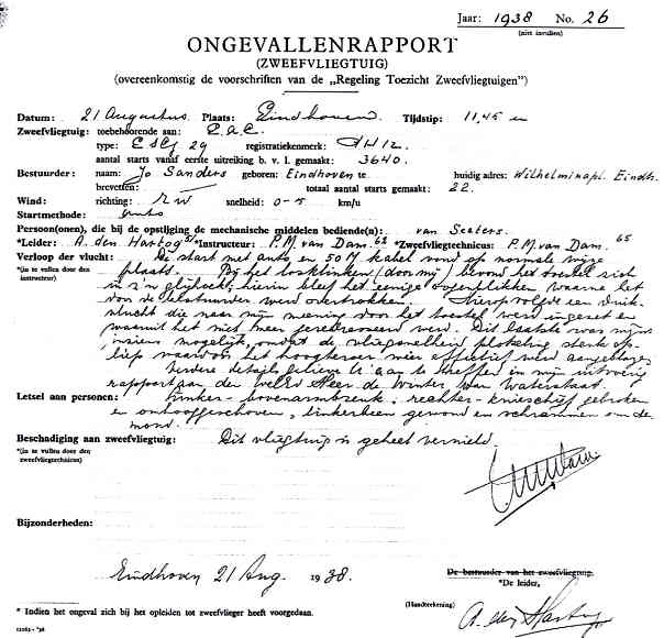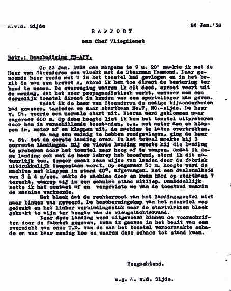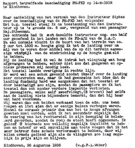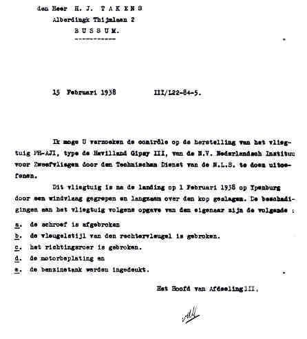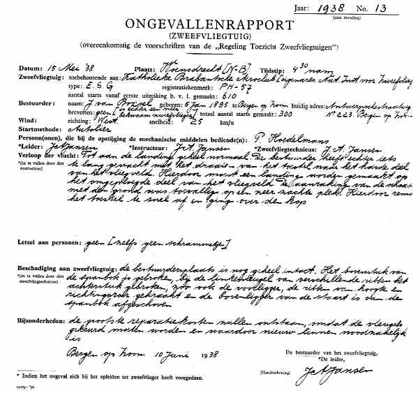 | Rechts het keuringsverslag dat D.J. Heuvelink opmaakte na inspectie van de reparatie van de PH-58. (Coll. H. Dekker) Ongevallenrapport 1938-16. (Coll. H. Dekker) ![]() |