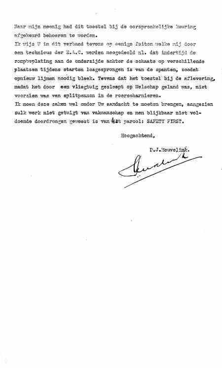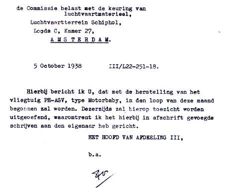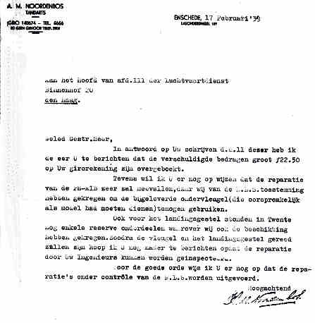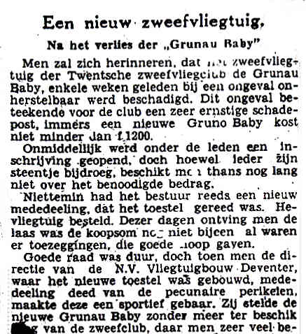 Wat er, gezien de toestand van het wrak, met "de herstellingen" in de brief hiernaast bedoeld wordt is me niet echt duidelijk. Op 28.1.1939 werd het herstelde toestel te Deventer weer gekeurd. Ik kan me niet anders voorstellen dan dat er minstens een geheel nieuwe romp werd gebouwd. Omdat de NV Vliegtuigbouw destijds Grunau Baby's in serie bouwde was dat een nogal logische oplossing. |