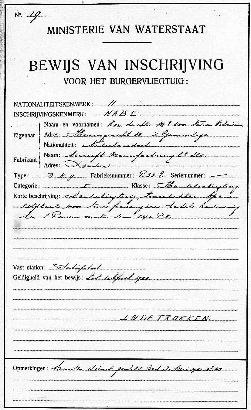 NB. In Dagboek van de Nederlandse Luchtvaart 1920 heb ik een aantal voorontwerpen van het Bewijs van Inschrijving