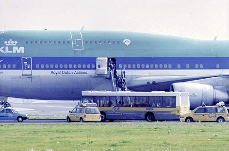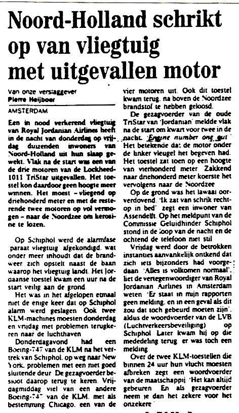 toestel, na dumpen van 2000 kg brandstof boven de Noordzee, terug naar Schiphol.
