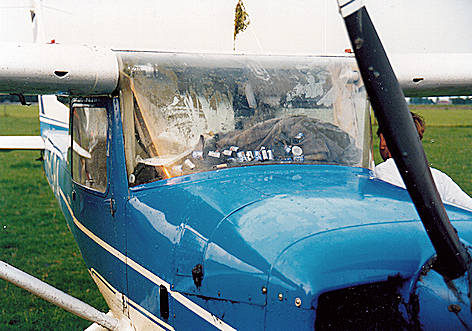 manoeuvre maken om de Lancair te ontwijken. De vlieger van de Lancair had door de laagstaande zon de