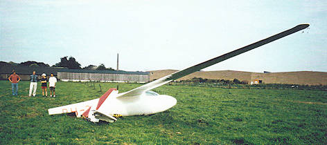 Tijdens de lierstart opende de achterste kap en versplinterde. De bestuurder ontkoppelde en landde rechtuit.