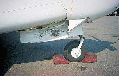 Een door Henk Wadman op Lelystad gemaakte foto waarop de schade aan de neuswieldeuren te zien is.